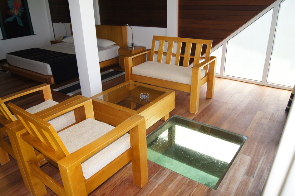 Nous avions donc un bungalow sur pilotis avec une chambre spacieuse avec dans le salon un petit carré de sol en verre pour voir les poissons passer, l’accès direct au lagon et aux eaux cristallines… (seul bémol, le bruit des climatiseurs des bungalows quand vous vous balader dans le coin, mais on n’y peut rien et cela s’oublie facilement)